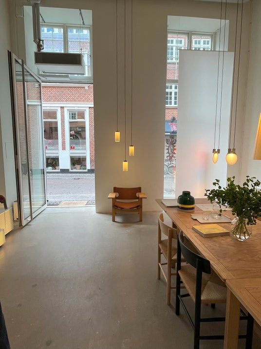 この日の最後は、ストロイエから程近い通り沿いの建物の4F、5Fに位置するFredericia(フレデリシア)ショールームを訪れました。階段の踊り場のTrinidad Chair(トリニダードチェア)がレンガ色の街並みを窓越しに遠くに見やり、ヴィンテージのMogensen Sofa(モーエンセンソファ)が出迎えてくれ…来場者がそれぞれの名作に思い思いに座りカフェタイムを楽しみながら、このブランドの歴史を直に味わっている様子がうかがえました。屋上のテラスにはフルリサイクルの樹脂を使用したPato series(パトシリーズ)のアウトドアチェアが並び、Bergs Potter(バーグスポッター)の陶器のローテーブルが味のある質感を醸し出しています。そして、この屋上からの眺め。Scandinavian Livingさんの企画にて開催された2021年7月のFredericiaオンラインライブセミナー(その時のメールマガジンバックナンバーはこちらです。)に参加した際に画面越しに見ていたコペンハーゲンの街並みを、実際にこのショールームから直接眺められたのは大変嬉しかったです。