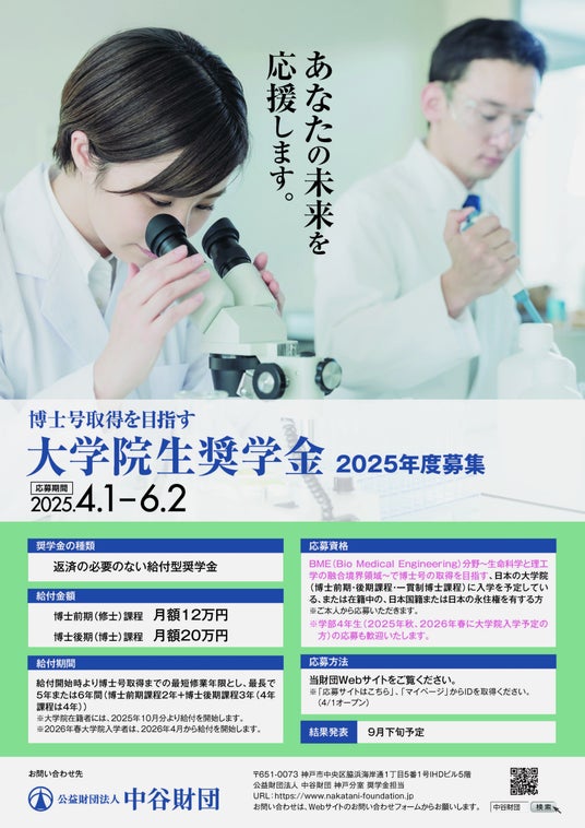 2025年度 中谷財団 大学院生奨学金 募集のお知らせ