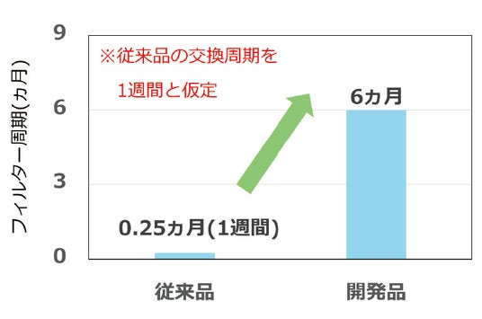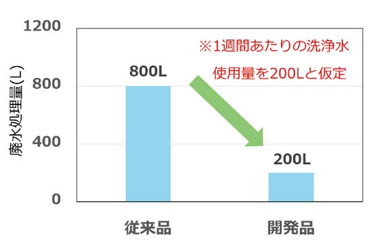 完全リサイクルPT装置では洗浄水に特殊な処理を施すため、洗浄水は繰り返し使用できるようになり洗浄水使用量をこれまでの約1/4に削減、また独自の油水分離フィルターを採用することでバイオフィルムの発生を抑制し、フィルター交換なしで6ヶ月以上の継続使用を実現しました。※1