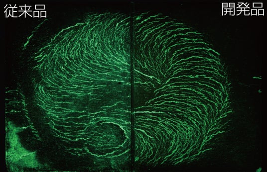 専用蛍光浸透液は従来品と同等の感度と洗浄性を維持しつつ、水に溶け出しにくいため再生効率が良く、再生水で洗浄しても検査面に蛍光体などの残渣が残りません。また繰り返し再生水を使用しても腐敗が起こりにくく、作業環境(悪臭)の改善や清掃頻度の低減にもつながります。さらに、専用浸透液の各成分は化学的に安定した材料で構成されているため、リサイクル効率が高いことが特徴です。