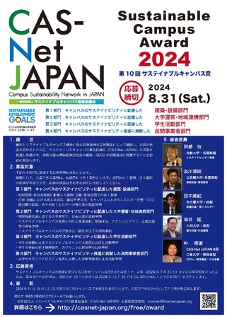 一般社団法人サステイナブルキャンパス推進協議会(CAS-Net JAPAN)は、大学・高等教育機関におけるSDGsやサステイナブルキャンパス構築に係る取組事例を表彰する「サステイナブルキャンパス賞」を2015年度より運営しています。今年度の募集を開始いたしましたのでお知らせいたします。
