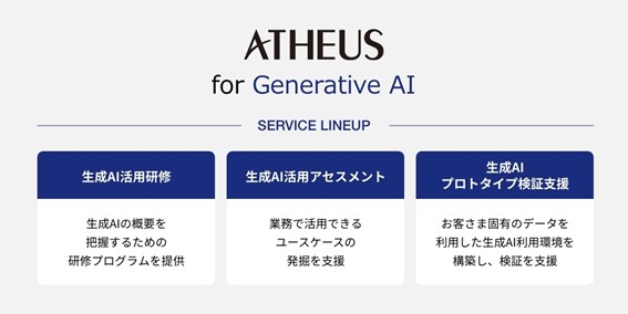AI Powerhouseは、お客さまの生成AIの活用を支援するサービス「ATHEUS for Generative AI」を提供しています。このサービスでは、生成AIに関する研修プログラムにはじまり、お客さまの課題抽出から実践まで、生成AIの活用をワンストップでサポートします。