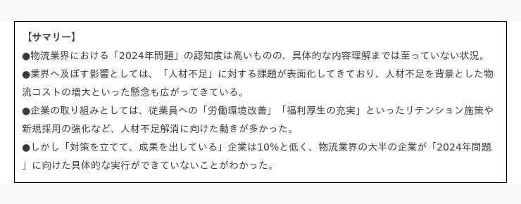 「2024年問題」について知ってはいるものの、具体的な取り組みには至っているのは3割弱にとどまり、また効果まで実感している企業は全体の5%にすぎないことがわかりました。
