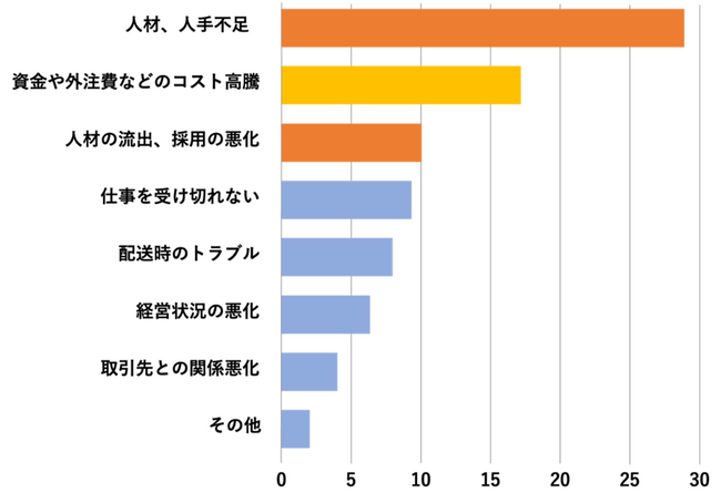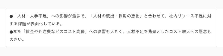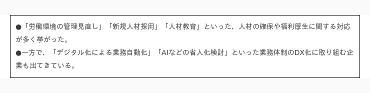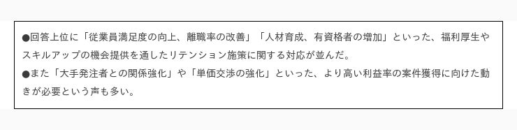 また、影響の懸念や、対策として求められるものも、人材不足や従業員満足度の向上、離職防止といった「人」の担保を挙げるこえが多く、逆を言えば、IT化や新規事業などを考え検討することに至っていない様相が感じられます。経営悪化を懸念する声も1割以上おり、この問題が目に見える形で影響が出てくるのは間近に迫っており、いわば「嵐の前の静けさ」を感じさせる現状を表していると言えます。