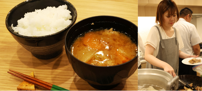 左/ごはん(ゆきさやか)とマロンポークの豚汁、右/調理中の小田野さんと長谷川さん。