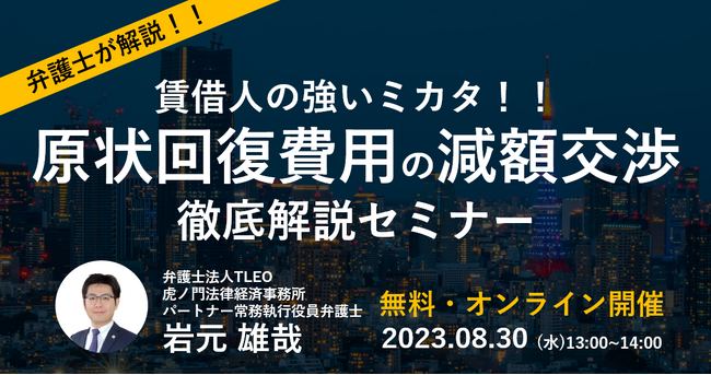 1972年の創業以来,数多くの不動産案件を解決してきた弁護士法人TLEO虎ノ門法律経済事務所(所在地:東京都港区、代表:千賀 修一)が、「賃借人の強い味方! 原状回復費用の減額交渉 徹底解説セミナー」を無料・オンラインで2023年8月30日(水)に開催いたします。