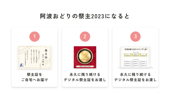 徳島県内や近郊の方々だけでなく、日本全国、あるいは世界中にいる阿波おどりを愛する全ての人々が本クラウドファンディングへの参加を通じて、「阿波おどりの祭主2023」としてお名前を永久に残していく仕組みです。ご支援いただいた実績を、公式ウェブサイトに掲載するほか、紙面で「祭主証」をお届け。さらに改ざんすることができず、未来永劫残り続けるデータとして「阿波おどりのデジタル祭主証」としてお渡しいたし、お届けいたします。この「一口祭主」は日本で初めての取り組みです。
