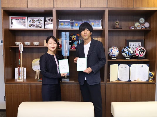 面談の様子(左:八幡市長 川田翔子氏、右:株式会社くらしラボ 国内EC事業部部長 與野)