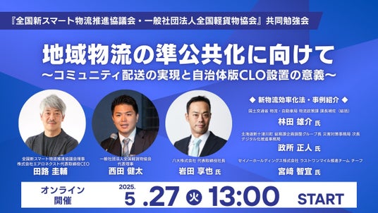 全国新スマート物流推進協議会(東京都渋谷区、会長:竹中貢 北海道上士幌町長 以下 本協議会)は、2025年5月27日(火)に、一般社団法人全国軽貨物協会(東京都港区、代表理事:西田 健太 以下全軽協)と共同して勉強会をオンラインにて開催いたします。