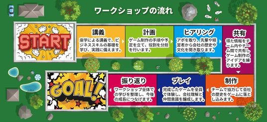 「沿革ゲームを作ろうプロジェクト研修」は、以下の流れで実施されます。