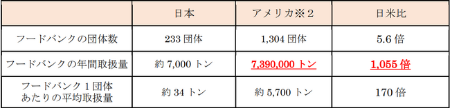 一方、アメリカのフードバンクの年間食品取扱量は739万トンで、これは国内の食品ロス発生量(523万トン)より多く、国内フードバンクの取扱量の1,000倍以上に相当します。このように、アメリカではフードバンクが膨大な量の食品ロス削減と、経済的な困難を抱える世帯への食料供給に大きく貢献しています。