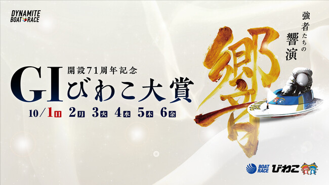 ボートレースびわこ(主催者:滋賀県)は、「開設71周年記念 GIびわこ大賞」を10月1日(日)~ 10月6日(金)に開催いたします。初日の第12レースにはボートレース界で偉大な功績を上げてきた選手のみに与えられる「ゴールデンレーサー」の称号を受賞した選手が熱いレースを繰り広げる「ゴールデンレーサードリーム戦」を全場に先駆けてボートレースびわこで初めて実施いたします。また、場内では「ゴールデンレーサードリーム戦」の開催を盛り上げるべく、オープニングセレモニーや出場選手のインタビューなども行います。