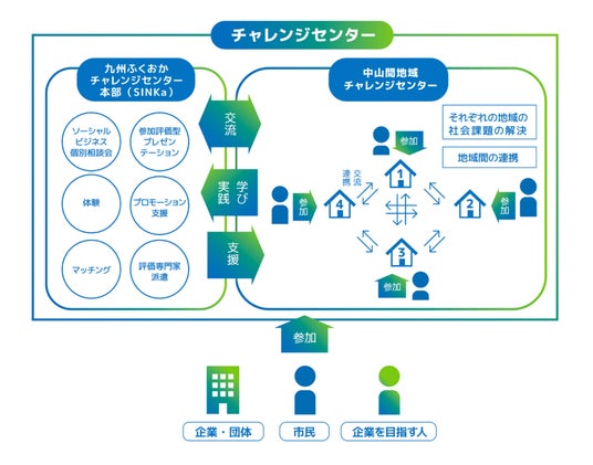 そこで私たちは、20代、30代の方々が課題解決へのチャレンジをしやすくなるよう、福岡都市圏と中山間地域の各地にチャレンジセンターを設立し、相互に連携することで、点ではなく「面」として九州のソーシャルビジネスをバックアップする体制をつくります。