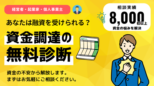 ファイナンスアイが培ってきた8,000社以上の創業融資・追加融資・協調融資・経営改善・企業再生・M&Aなどのリアルな経験と知識をもとに、実際に資金調達が可能なのか、可能な場合にどのような施策をすれば、どれくらいの資金調達が可能なのかをお伝えしています。診断は無料ですので、ぜひお気軽にご利用ください。