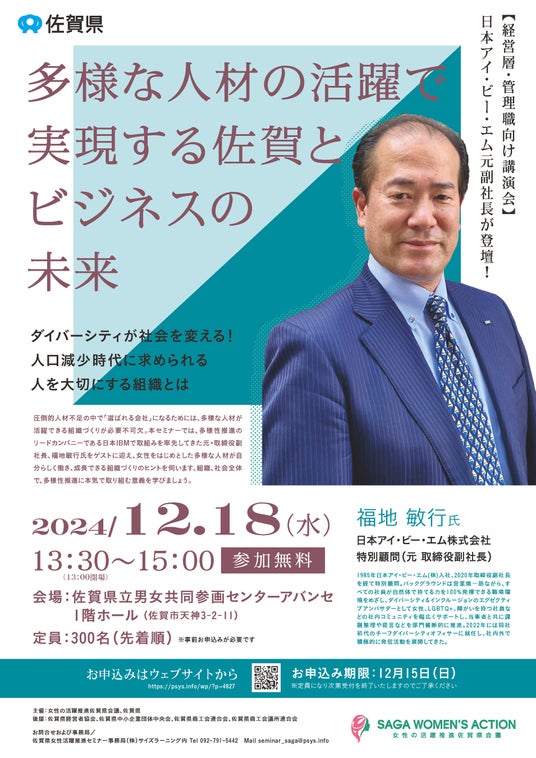 ダイバーシティ&インクルージョン・人的資本経営を軸に人材開発・組織開発を支援する株式会社サイズラーニング(本社所在地:福岡県中央区、代表取締役:高見真智子)は、この度、佐賀県「女性活躍推進セミナー委託業務」を受託し、佐賀県内企業や団体の経営層・管理職等を対象とした講演会を開催します。日本アイ・ビー・エム元副社長の福地敏行氏をゲストに迎え、圧倒的人材不足の中で「選ばれる会社」になるために不可欠な多様性の推進、人的資本経営について考えます。