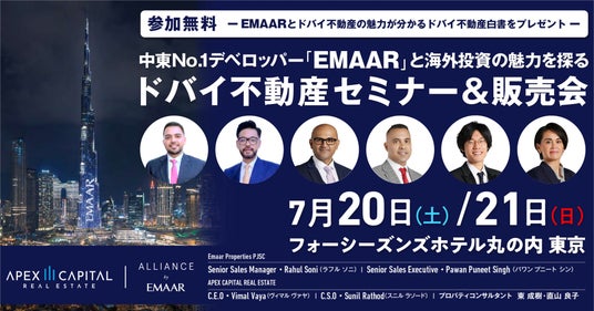 ドバイの不動産売買や不動産管理サービスを手がけるApex Capital Real Estate(アペックスキャピタル リアルエステート、以下「アペックスキャピタル」)は、中東No.1デベロッパー「EMAAR(以下「エマール」)」を招き、ドバイの基礎情報や購入事例からエマールが注目するエリアまで紹介する『ドバイ不動産投資セミナー』を2024年7月20日(土)、21日(日)の2日間限定で開催いたします。なお、当日は参加者限定でその場で特別枠が買える販売会や個別相談会も実施いたします。