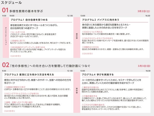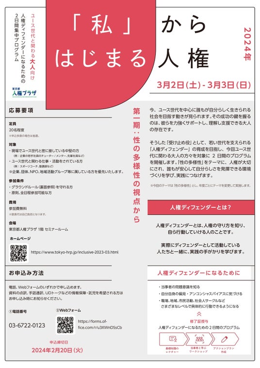そうした「受け止め役」として、若い世代を支えられる「人権ディフェンダー」の育成を目指し、今回ユース世代に関わる大人の方々を対象に2日間のプログラムを開催します。「性の多様性」をテーマに、人権が大切にされ、誰もが安心して自分らしさを発揮できる環境づくりを学び、実践につなげます。