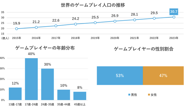昨今、ゲームプレイ人口は急速に増加しており、2023年には全世界で30億人を突破、ゲームコンテンツは性別や世代を問わず幅広い生活者に楽しまれています(下図)。その中でも特に、Z世代・α世代など若年層を中心にゲームへの可処分時間の投下は増加傾向にあり、ゲーム媒体は新たなメディアとしての価値を持ち始めています。従来メディアではリーチが難しいとされる若年層への訴求方法として、ゲーム媒体の効果的な活用の需要が拡大しており、多くの広告主企業や広告会社からの注目が高まっています。