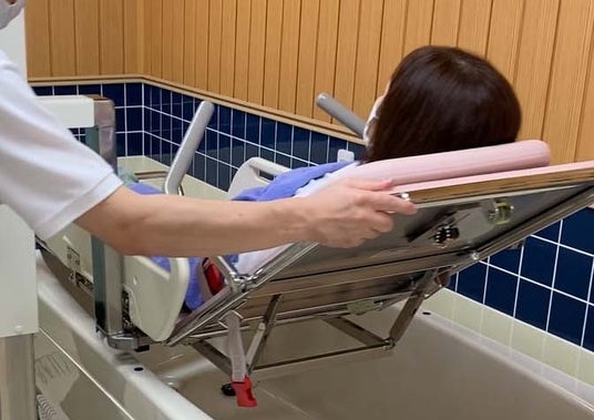 大浴場タイプの一般浴室には、浴室用車いすのまま浴槽に入れるようスロープを設置し、可能な限り大きなお風呂でゆったりと入浴していただけるよう工夫しています。もちろん、寝たきりの方など座位の保持が困難な方にも安心して入浴していただけるように、寝たまま入浴が可能な機械浴槽もご用意しています。