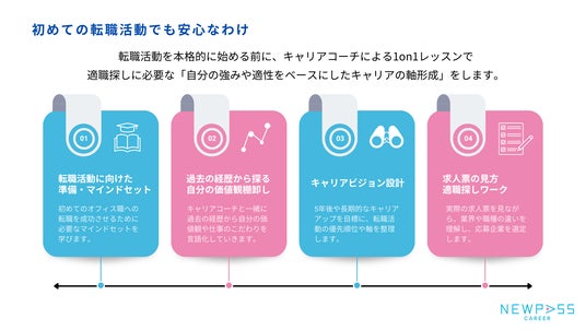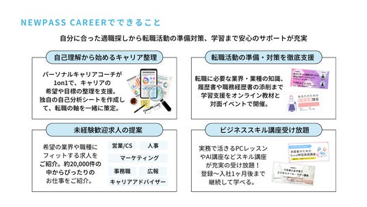 「NEWPASS CAREER」は、キャリアコーチによる適職探しからビジネススキルの学習・面接対策まで、1人1人の目指すキャリアに合わせて学習カリキュラムを提案し、「未経験からオフィス職への転職を叶えるエージェント」として、サービスを展開いたします。