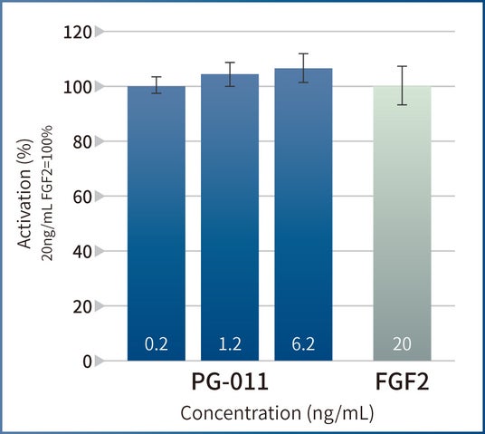 PG-011は、FGF2と同様にFGFR1cに対するリン酸化活性を持つことを確認しました(図2)。さらにPG-011のヒトMSCに対する細胞増殖活性を、リコンビナントFGF2と比較を行いました。その結果、PG-011はモル濃度での比較で、FGF2とほぼ同等のヒトMSCに対する増殖活性を示し、質量濃度(ng/mL)ベースでの比較では、約3分の1の濃度で同等のヒトMSCに対する増殖活性を示しました(図3)。
