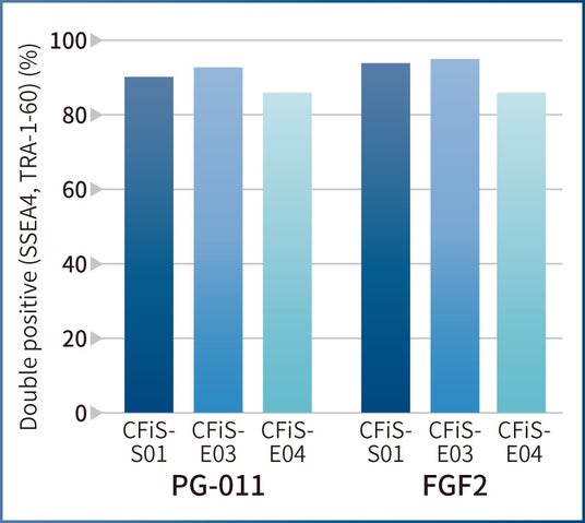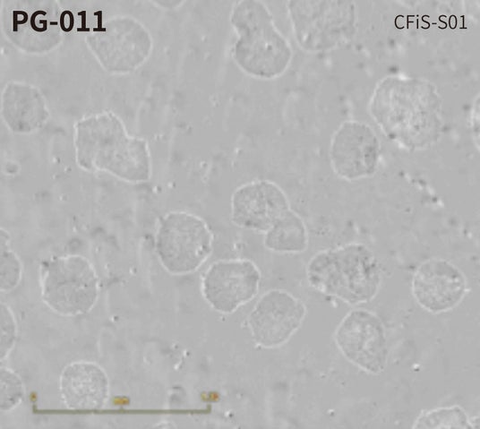 その結果、3回の継代操作後、PG-011およびFGF2を使用した条件下で、iPS細胞はほぼ同様の形態を示すことが確認されました。さらに、未分化マーカー(SSEA4およびTRA-1-60)の測定結果においても、PG-011を用いて培養したiPS細胞は、FGF2を用いた場合と同様の陽性率を示しました。また、培養期間中の細胞増殖率についても、PG-011とFGF2の両条件で同等であることが確認されました。これらの結果から、PG-011はFGF2と同等のiPS細胞の未分化維持能を有することが示唆されました。