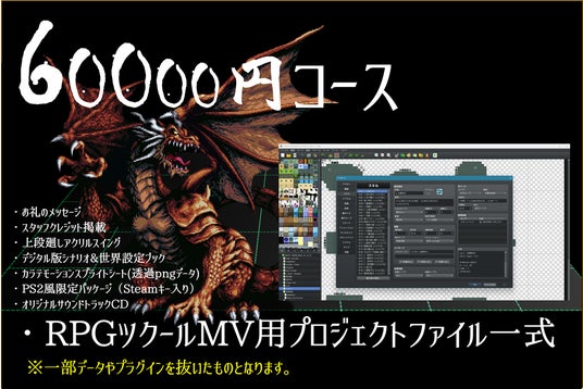 最高額となる60,000円の支援コースをお申込みいただいた方には、完成したゲームのRPGツクールMV用プロジェクトファイルを丸ごと、お送りいたします。
