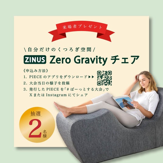 ZINUS JAPAN様より「Zero Gravityチェア」を抽選で2名様にプレゼント!会場で座り心地も体験できます。皆様お誘い合わせの上「ぼーっと」しに来てください。