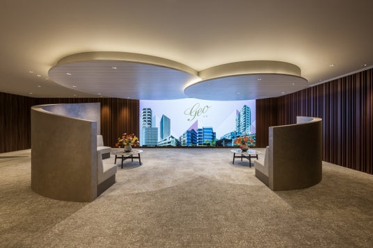 エントランス ウェイティングゾーンには、ジオブランドの「品格」と「上質さ」を象徴する映像演出を中心に構成された大型LEDビジョンが設置され、空間全体を包み込むようにブランドメッセージが展開されます。また、木調の素材や曲線的なフォルムによって、訪れるお客様にぬくもりと安心感を提供します。