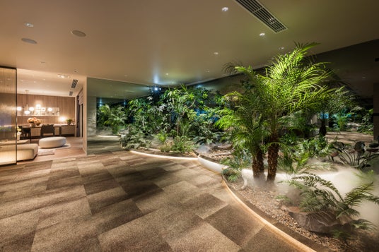 グリーン演出・プロデュースの専門ファームである株式会社 緑演舎との共創により本物の植栽を採用。木々に包み込まれるような自然本来の生命力を感じられるデザインを追求し、視点を変えるたびに異なる景色を楽しめる空間としています。また、透明ディスプレイを活用した映像演出を計画し、自然とテクノロジーが調和する構成に。サステナビリティの視点からも意義のある取り組みであり、「環境と調和したくらし」のあり方を象徴する空間として位置づけられています。