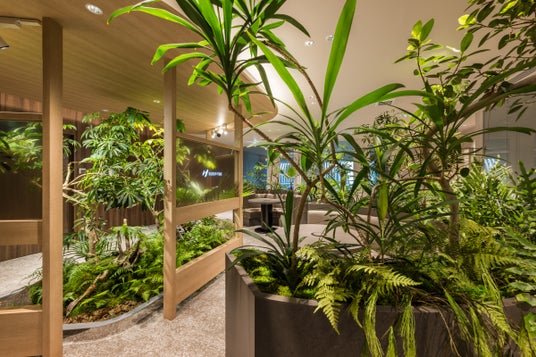 植栽の配置や空間のつながりには細やかな工夫を凝らし、流木・砂利・景石といった自然素材を用いて、五感を通じて自然と共鳴する空間を創出。さらに透明ディスプレイやタッチ式サイネージを取り入れ、植栽とデジタルコンテンツが互いに引き立て合う設計としています。