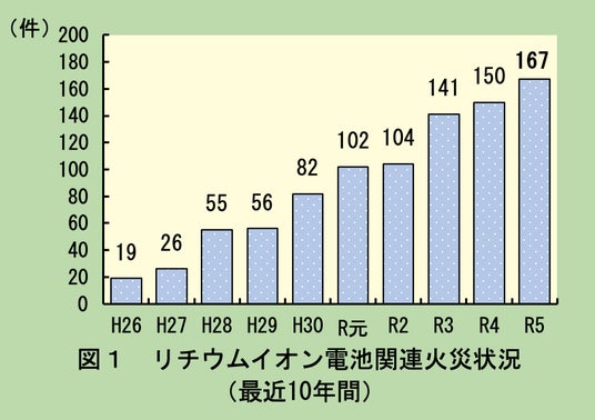 リチウムイオン電池に関連する火災は全国的に増加しており、東京消防庁の発表によると東京消防庁管内では平成25年(2013年)には19件であったものが、令和5年(2023年)には過去最多となる167件になっています。さらに令和6年(2024年)は6月末時点で既に107件(速報値)が発生しており、依然として増加傾向にあることが報告されています。