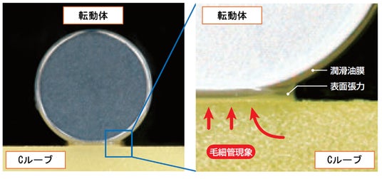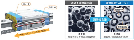 Cルーブは、多孔質の焼結樹脂に潤滑油を含侵させた潤滑部品です。Cルーブと転動体が接触すると、毛細管現象により必要最小限の潤滑油が転動体の表面に直接供給されます。これによって、長期間のメンテナンスフリーによる経済性と潤滑油の消費量抑制(オイルミニマム効果)による環境負荷低減の両面を同時に実現しています!