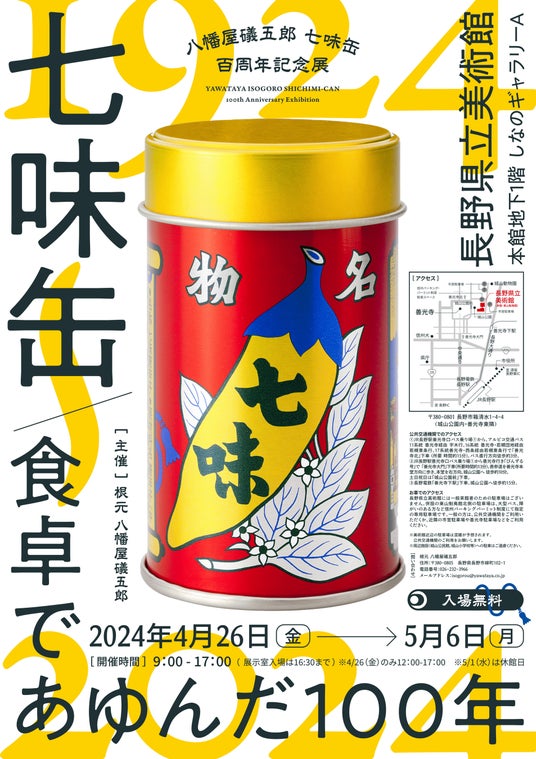 株式会社 八幡屋礒五郎(代表取締役社長 九代目 室賀栄助)は、「八幡屋礒五郎 七味缶 百周年記念展 七味缶 食卓であゆんだ100年」を4月26日(金)より長野県立美術館にて開催します。