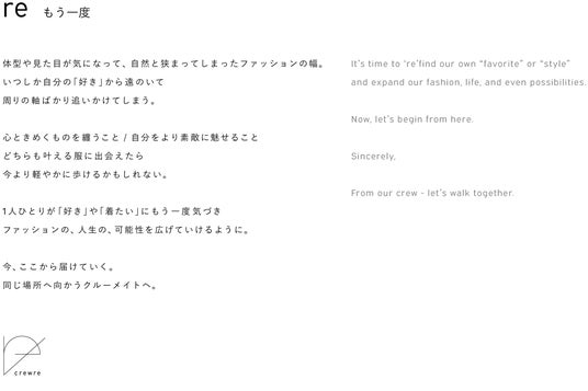 ブランドのコンセプトに共感し関わってくださる全ての方 = crew へ、ありのままの自分がもっと輝けるお洋服を届けていくブランドです。
