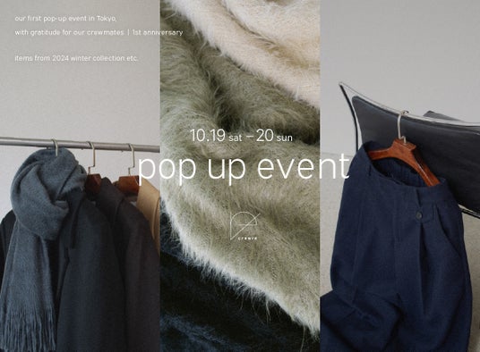 今回開催するポップアップイベントでは、コートやニット、小物を含む、crewre 2024 winter collectonの様々な商品をいち早くお手に取ってご覧いただけるほか、ご来場者様限定で後日先行販売を実施。