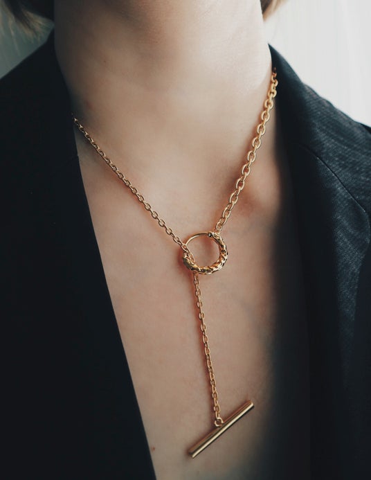 長さ調整が可能なネックレスは、単品でも存在感があり、