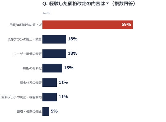 回答者が経験した価格改定の内容は、「月額/年額料金の値上げ」が69.2%で最多でした。次いで「既存プランの廃止・統合」(18.5%)、「ユーザー単価の変更」(18.5%)が続きます。
