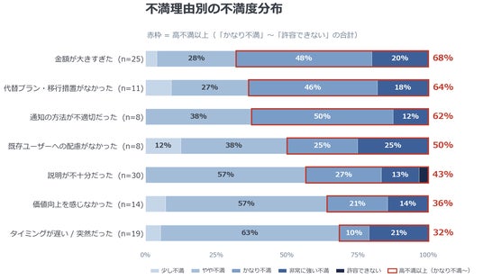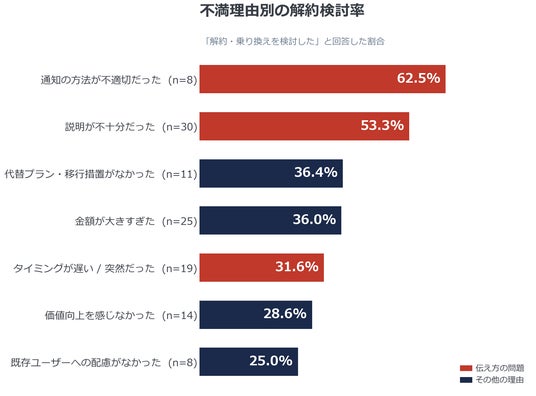 ※「通知の方法が不適切だった」はn=8と少数のため、傾向値としてご参照ください。なお、「説明が不十分だった」(n=30)および「タイミングが遅い/突然だった」(n=19)は一定のサンプル数があり、伝え方の問題が解約に直結する傾向は頑健です。