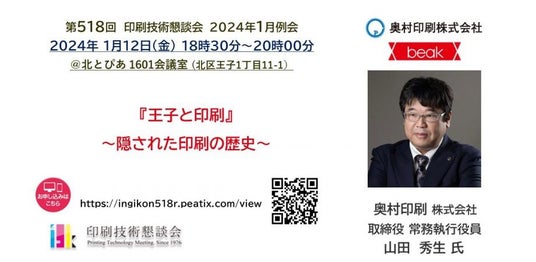 印刷技術懇談会とは、印刷に関する諸問題を専門家と検討し、その内容を深めるための勉強会です。1976年6月より活動を始め、現在まで毎月1回、年11回の例会を継続的に開催し、2022年4月で500回を数えました。印刷技術に関心がある方が幅広く参加しております。リカレント教育やリスキリングなどの必要性が喧伝される現在だからこそ、印刷技術をベースにしながらも製版・印刷技術・営業・マーケティング・印刷ビジネスなど、幅広いテーマで開催しています。今回開催される第518回印刷技術懇談会では、奥村印刷株式会社 取締役常務執行役員である山田氏が、長年勤務している北区王子の町が如何に印刷の歴史上、重要な地であったかを技術者の視点で紐解きます。奥村印刷株式会社は、日本発明振興協会・日刊工業新聞社共催「第48回(2022年度)発明大賞」で自社開発し、特許を取得している『折り紙食器beak』で「考案功労賞」を受賞、山田氏は同製品の開発者としても知られています。是非ご参加いただければ幸いです。【チケットはこちらから】