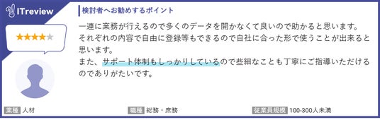 ビジネス向けIT製品・クラウドサービスのレビュープラットフォーム「ITreview(アイティレビュー)」では、集まったリアルユーザーのレビューをもとに、顧客満足度や市場での製品認知度が把握できる独自の四象限マップ「ITreview Grid」を展開しています。