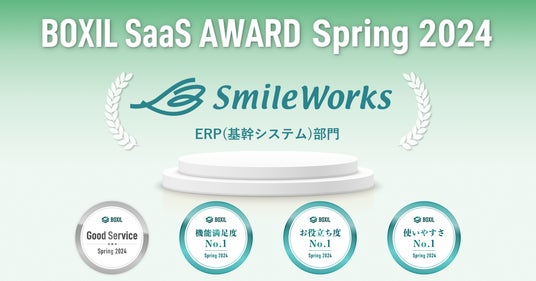 株式会社スマイルワークス(東京都千代田区、代表取締役社長:坂本 恒之、以下「スマイルワークス」)が提供するクラウドERPシステム「SmileWorks」 は、スマートキャンプ株式会社(以下「スマートキャンプ」)が主催する「BOXIL SaaS AWARD Spring 2024」のERP(基幹システム)部門で「Good Service」、「機能満足度No.1」、「お役立ち度No.1」、「使いやすさNo.1」に選出されました。前回「BOXIL SaaS AWARD Winter 2023」に続く、受賞となりました。