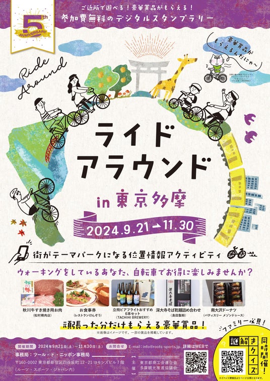 「ライドアラウンド in 東京多摩」とは、多摩地域30市町村の観光地などに400以上設定した観光地等のスポットを巡りポイントを集め、商品をゲットする「期間型エリア探索サイクリング」イベントです。