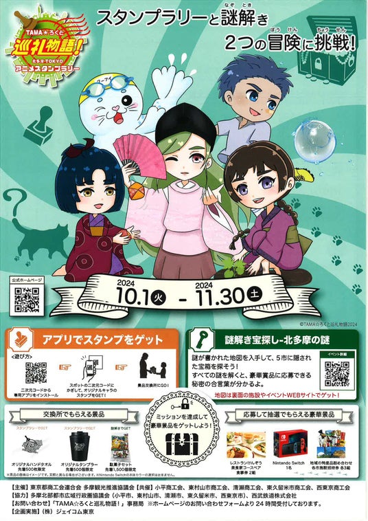 参加方法は、「北多摩TOKYOアニメスタンプタンプラリー」専用サイト(https://kitatama-stamprally.com/)にアクセスいただき、謎解き台紙をGET & スタンプラリー専用アプリをインストールし、スタンプラリーの詳細をご確認の上、ご参加ください。
