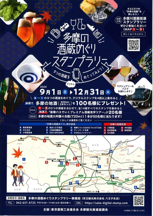 期間は、2024年9月1日(日)~12月31日(火)。参加方法は、多摩の酒蔵めぐりスタンプラリー専用サイト(https://sake-digital-stamp.com/)にアクセスいただき、スタンプラリーの詳細をご確認の上、サイト内スタンプラリーシステムのURL若しくはQRコードよりご参加ください。