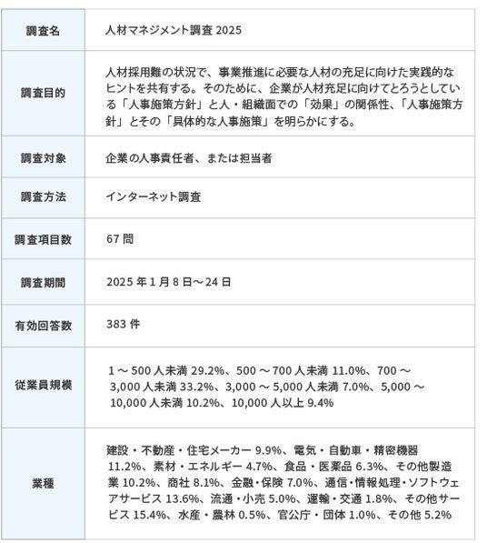 こうした背景を踏まえ、本調査は、現状における企業の人材マネジメントを把握し、今後の実践的なヒントを得ることを目的に企画されました。