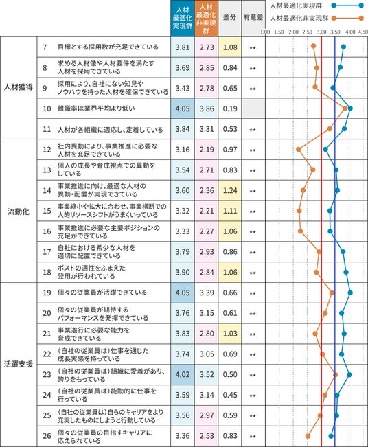 ・「人材の最適化」の実現群と非実現群の差が際立つ結果に