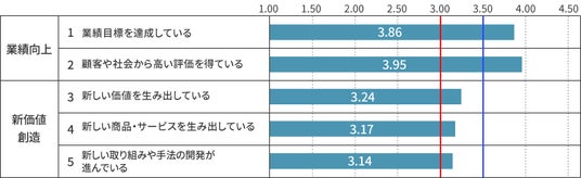 ・回答企業383社の項目ごとの平均値(5点満点)では「業績向上」に関する2項目はどちらも3.50*を上回り、「新価値創造」に関する3項目はいずれも3.50を下回る結果に