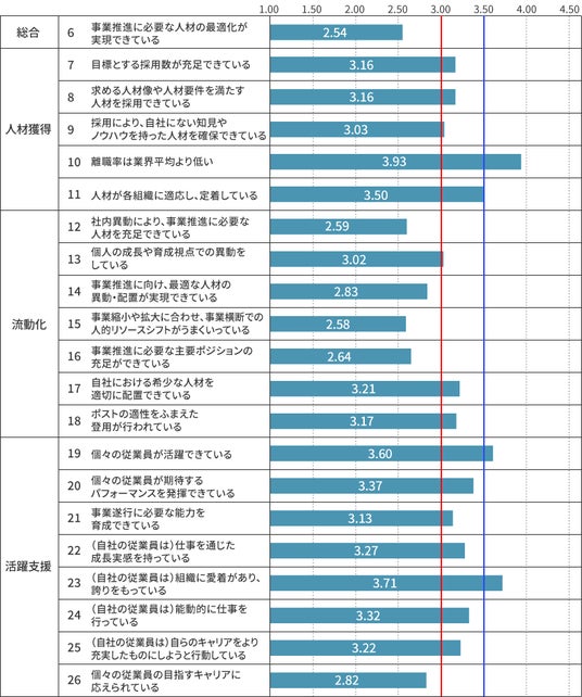 ●「人材の最適化」に課題感。なかでも「流動化」の値が低く、多くの項目で3.00を下回った