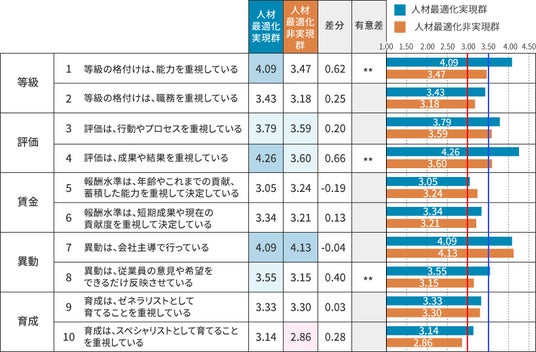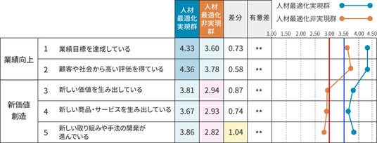 一方、「人材最適化非実現群」は「新価値創造」の3項目において3.00を下回りました。また、すべての項目で群間の差は統計的に有意でした。